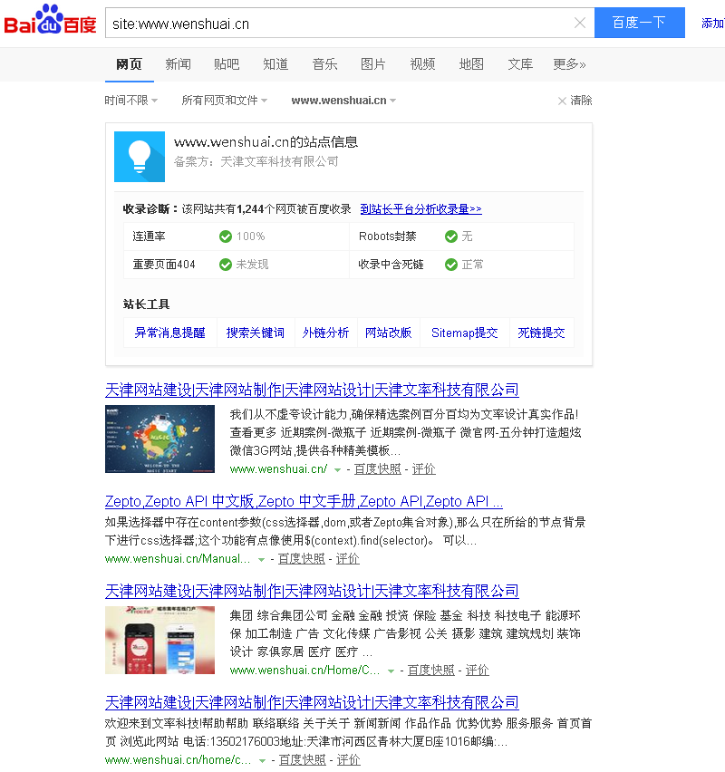 2.百度收錄:在百度里面通過指令site:就可以查詢到。通過收錄,我們可以分析出一系列的問題,如site:m.nfmori.cn 見下圖我們可以看到文率科技的首頁在⑴位,如果不在⑴位或者收錄降了很多說明網(wǎng)站被降權(quán)了,這樣我們就可以通過收錄的數(shù)據(jù),對(duì)比同等級(jí)下的兩個(gè)頁面(一個(gè)收錄了一個(gè)未收錄),找出頁面未收錄的原因,從而改進(jìn)。