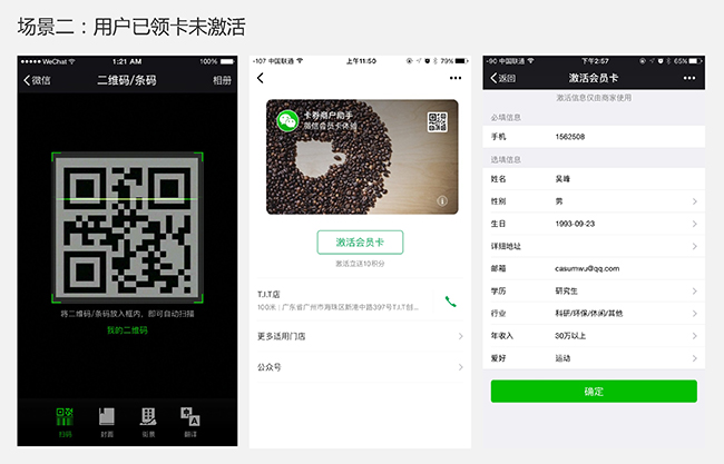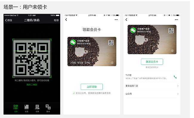 新版會員卡將多種功能集合在一個二維碼上:未領(lǐng)卡用戶掃碼后,領(lǐng)取頁面將默認勾選關(guān)注公眾號選項,用戶點擊立即領(lǐng)取后,將在領(lǐng)卡同時關(guān)注商家公眾號;領(lǐng)卡未激活用戶掃碼后引導(dǎo)激活;已領(lǐng)卡并激活的會員用戶掃碼可直達卡面,進行支付、查看積分等商家設(shè)置的操作。