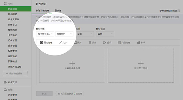 商家可以根據(jù)自身需求,在會員管理頁面為會員添加自定義標(biāo)簽,群發(fā)消息時,可選擇指定的會員標(biāo)簽定向群發(fā)。注意,會員需關(guān)注公眾號才能收到商家群發(fā)的消息。