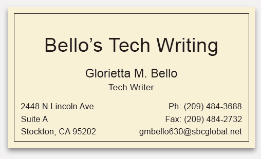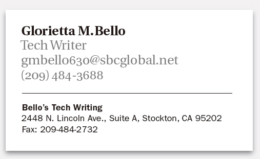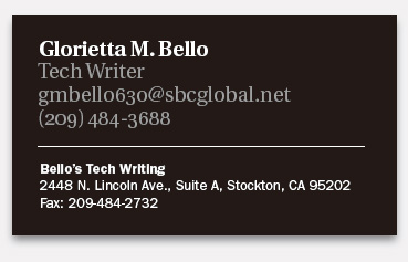 而上圖,同樣的信息,卻是經過設計的。自信的名字及職務在白色的卡片上左對齊,突出了Glorietta本人,而不是那個了無生氣的企業(yè)名稱,并且該老兄是一名科技作家,有意識的排版突出了“寫作”這一抽象意義。較大的文字自動傳達有效的信息溝通。通過對比(大/小,襯線體,非襯線體)形成有組織、有目的的構成,傳達出一種簡樸的風格,但并不乏味。如果還想更引人注目,可以象下面一樣更換一下顏色區(qū)域: