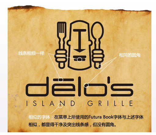 我們很喜歡DELO小島燒烤店的菜單,因為在我們的眼中它顯得很酷,它只是由黑白線條(沒有灰度)構成,這些線條構成了餐廳的標志及名稱。既經典又實惠的設計!
