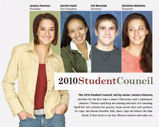 富沖擊力的排版使這張學生會成員介紹的設計顯得非常突出,它比普通的那種傻乎乎的團隊照效果更好,因為設計師可以靈活安排其中每個人的照片,使到整體既具有一種團隊的氛圍,但同時又能顯示出每個人的特性。使這些學生與觀看的人在情感上距離更近。這樣的排版另外的好處就是能夠讓你在版面空間的安排上更靈活,并且有更多的空間給你的放置標題及文字。