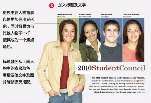 最后,這個學生會成員的設計就變成上圖這樣,其中學生會主席的形象顯得更加重要且成為一個焦點。該設計主要通過三個步驟即可完成: