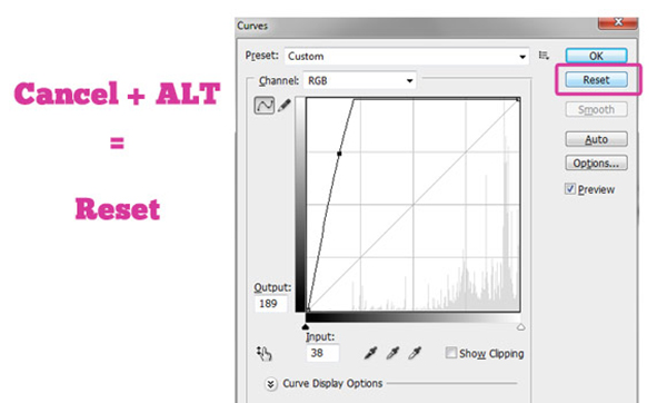 ps的小白們一定會覺得曲線和色階調(diào)整不好把控,部分時候有些色階結合或其他的調(diào)整不能很好的融合,而這到時設計師不得不重新開始,通俗的對應方法是:點擊取消按鈕,或者重新打開調(diào)整面板。不過這里文率小編想給大家分享一個節(jié)省時間的小竅門,當你想要重新做一個曲線,不要直接點擊取消按鈕,按住ALT鍵,“取消”將會瞬間變身成一個叫“復位”的東西,點擊復位,曲線就會回到初始狀態(tài)啦!