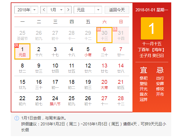 1、2017年12月30日至2018年1月1日放假,共3天。