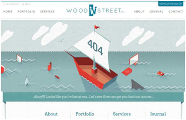 Woodstreet的404頁面也證明了他們的能力,它404頁面中的“Ahoy”讓人似乎聽到了海上人們的吶喊,漂浮的船只、隱現(xiàn)的鯊魚鰭,甚至還有幾臺(tái)辦公設(shè)備。讓原本焦躁的用戶慢慢平靜了下來,被Woodstreet的設(shè)計(jì)吸引。