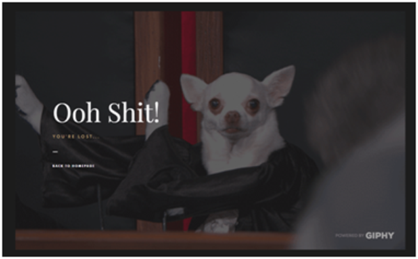 設(shè)計(jì)公司Dogstudio的404頁面上有一個(gè)狗狗動(dòng)圖,似乎狗狗真的說了“Ooh shit!”(表不滿),將人們看到404錯(cuò)誤頁面時(shí)的不爽表現(xiàn)了出來。相信看到這么個(gè)錯(cuò)誤頁面,你的不滿會(huì)瞬間消失。