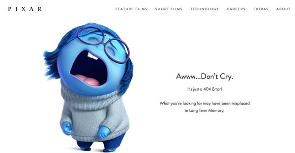 當(dāng)你在Pixar的網(wǎng)站上迷失以后,會(huì)出現(xiàn)上圖這么一個(gè)404錯(cuò)誤頁面,頁面里藍(lán)色哭泣小人是Pixar著名動(dòng)畫《頭腦特工隊(duì)》里的主人公之一憂憂(Sadness),她似乎感受到了用戶的悲傷。憂憂旁邊還有一句俏皮話“不要傷心,你要找的頁面可能已經(jīng)丟失在‘長(zhǎng)期記憶’ 中了”,相信再沮喪的用戶看到了這么一個(gè)具有感染力,又貼心的畫面,也會(huì)被逗笑吧。