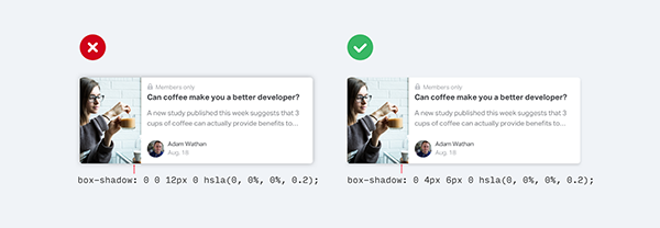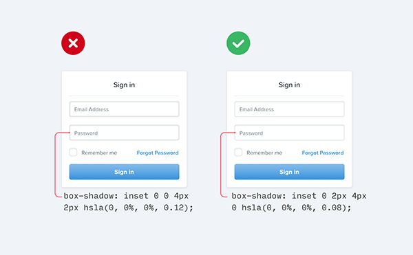與大面積擴(kuò)散模糊陰影相比,使用微妙的垂直偏移陰影效果更明顯,更自然,它模擬了最常見的光源特征,光線從上往下照下來從而營造陰影效果,如果你對(duì)此有興趣,Material Design Guideline非常清晰講述了這樣陰影的制作細(xì)節(jié)。