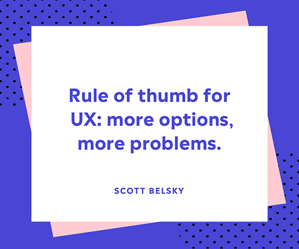 若無(wú)法真正理解人與設(shè)備之間的關(guān)系,那么在設(shè)計(jì)時(shí),總會(huì)不自主的認(rèn)為用戶和設(shè)計(jì)者一樣了解產(chǎn)品,或認(rèn)為用戶的「主觀能動(dòng)性」足夠強(qiáng),繼而為設(shè)備和產(chǎn)品增加更多的功能,更多的選項(xiàng),然而事實(shí)證明這個(gè)觀念是錯(cuò)的。更多的選擇和更多的選項(xiàng)往往會(huì)帶來(lái)更大的認(rèn)知負(fù)荷,這一點(diǎn)是違反普通人的認(rèn)知習(xí)慣的,人們面對(duì)更多選擇時(shí),很難作出決定。所以給用戶少一點(diǎn)選擇,降低認(rèn)知負(fù)荷,提高任務(wù)的完成度,這樣整個(gè)用戶歷程也更順暢。