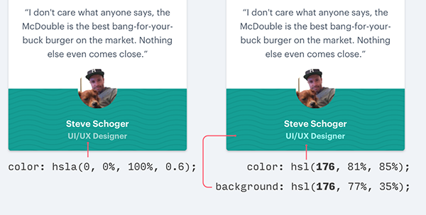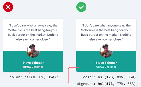 若背景顏色是白色,這時(shí)將黑色的文本改成灰色,不失為一個(gè)不錯(cuò)的淡化其視覺(jué)效果的做法,但是若背景是色彩的,那這就是另外一回事了。實(shí)際上,白色背景下文本有黑變灰達(dá)到了降低對(duì)比度的效果,但在色彩背景下,想要降低對(duì)比度正確的做法就是讓文本逐步的接近背景色,而并非是改為灰色。一般來(lái)說(shuō),想要降低和背景色之間的對(duì)比,通常做法有兩種: