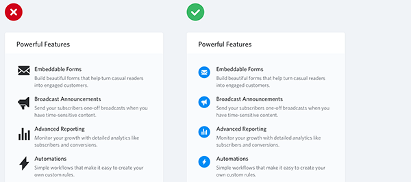 當(dāng)設(shè)計(jì)著陸頁(yè)的時(shí)候,可以會(huì)突出產(chǎn)品的功能,這時(shí)你需要一些大的圖標(biāo)作為視覺(jué)錨點(diǎn),這樣的話你很可能會(huì)去 Font Awesome 或 Zondicons 這樣的網(wǎng)站找?guī)讉€(gè)免費(fèi)的矢量圖標(biāo),然后將其放大到你所需要的尺寸。雖說(shuō)矢量圖可以無(wú)損的放大,但是一個(gè)通常只有16×16 的圖標(biāo)放大三四倍,它固然無(wú)損,但是在視覺(jué)上就顯得頗為不專注了:缺乏細(xì)節(jié),總感覺(jué)過(guò)于矮胖。