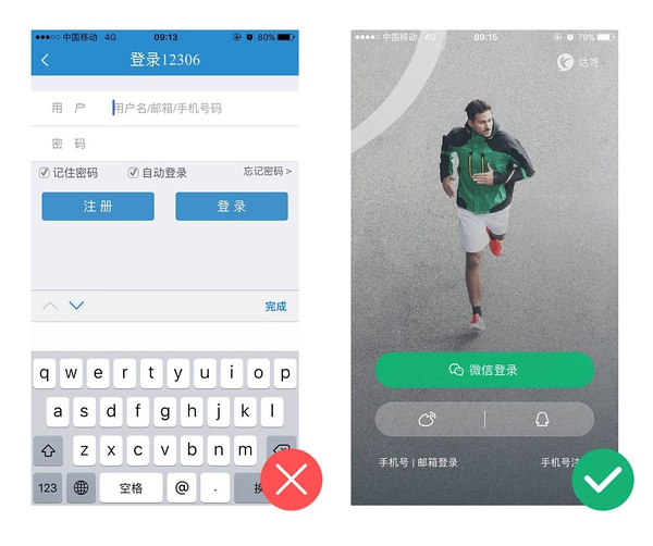 美學(xué)在設(shè)計(jì)產(chǎn)品的使用上扮演著重要的角色。美的設(shè)計(jì)能促進(jìn)人們形成正面積極的態(tài)度,而且讓人們對(duì)產(chǎn)品設(shè)計(jì)上的缺陷更具有包容性。如:同樣都是登錄頁(yè)面我們更容易接受右面的設(shè)計(jì),并且我們會(huì)通過(guò)是否美觀推斷右面的APP應(yīng)該更好用,畢竟一個(gè)好用的APP應(yīng)該都會(huì)好好“打扮”一下吧!