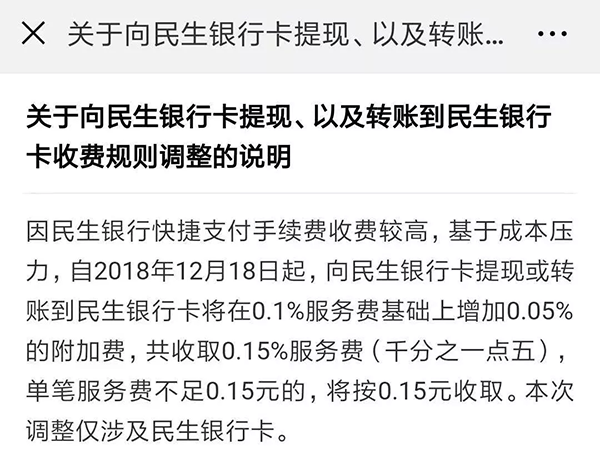 由于民生銀行快捷支付手續(xù)費(fèi)收費(fèi)較高,基于成本壓力,從微信零錢提現(xiàn)或轉(zhuǎn)賬到民生銀行卡需要在服務(wù)費(fèi)0.1%的基礎(chǔ)上,加收0.05%附加費(fèi),共收取0.15%服務(wù)費(fèi)(千分之一點(diǎn)五)。單筆服務(wù)費(fèi)不足0.15元的,將按0.15元收取,本次調(diào)整僅涉及民生銀行卡,微信支付強(qiáng)調(diào)不會(huì)以收取提現(xiàn)服務(wù)費(fèi)作為平臺(tái)的盈利手段。