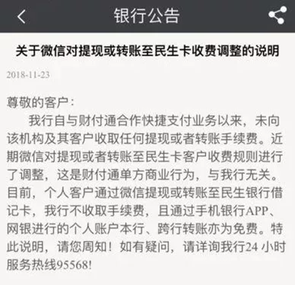 近日微信發(fā)布了一則公告稱:自2018年12月18日開始,民生銀行卡體現(xiàn)和轉(zhuǎn)賬將在加收0.05%手續(xù)費(fèi),對(duì)此,民生銀行發(fā)布公告稱:收費(fèi)為財(cái)付通單方面行為,與民生銀行無關(guān)……吃瓜群眾表示:和誰有關(guān)都不想付啊……