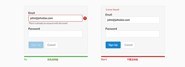 指定錯(cuò)誤內(nèi)聯(lián),告知用戶發(fā)生錯(cuò)誤的位置及原因。對(duì)于位置,就是要明確的告知用戶具體是那個(gè)地方出現(xiàn)的錯(cuò)誤,而并非是簡(jiǎn)單的告知用戶有錯(cuò)誤;對(duì)于錯(cuò)誤,不但要告知用戶錯(cuò)誤的原因,還要告訴其相應(yīng)的解決辦法,引導(dǎo)用戶做出正確的操作。