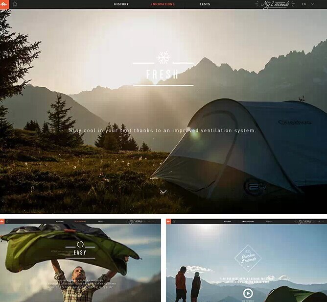 例如,Quechua山地運(yùn)動品牌,通過幾張照片和簡單文字的說明,將Quechua帳篷的特點及所處環(huán)境真實體現(xiàn),仿佛一場美妙之旅讓人心動。