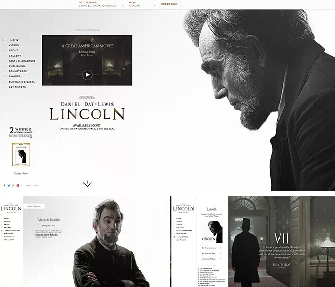 例如:LINCOLN電影網(wǎng)站,運(yùn)用最常用的黑白兩種顏色搭配,讓網(wǎng)頁如此簡約大方,給人留下無限想象空間。