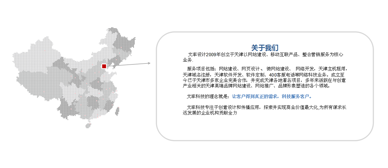 文率科技的服務(wù)項(xiàng)目包括:天津網(wǎng)站建設(shè)、微網(wǎng)站建設(shè)、天津網(wǎng)站設(shè)計(jì),網(wǎng)絡(luò)開(kāi)發(fā),天津主機(jī)租用,天津域名注冊(cè),天津軟件開(kāi)發(fā)、軟件定制、400客服電話等網(wǎng)絡(luò)科技業(yè)務(wù)。成立至今已于天津市多家企業(yè)完美合作,并完成天津各地著名項(xiàng)目,多年來(lái)活躍在與創(chuàng)意產(chǎn)業(yè)相關(guān)的天津高端品牌網(wǎng)站建設(shè)、網(wǎng)站推廣、品牌形象塑造的各個(gè)領(lǐng)域。