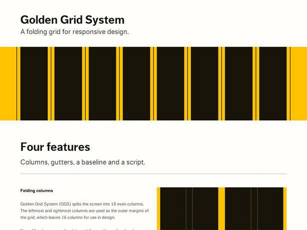 Joni Korpi的開發(fā)和Less Framework是同一人,近期已經(jīng)發(fā)布了這個可靠的Grid系統(tǒng)的新版本。因為其易于適應從16個到8個到4個欄,被視為“折疊式”。Golden Grid System還具有另一個特色,可以在測試時用一個小型瀏覽器覆蓋您所制作的頁面上的Grid。