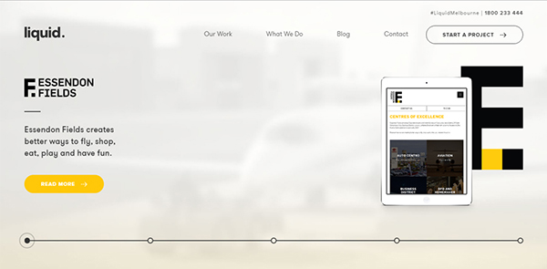 Liquid Agency 最拿手的就是在創(chuàng)造獨(dú)特的品牌體驗(yàn)上,這一點(diǎn)從他們的官網(wǎng)上就可以看出來(lái),黑白灰+提亮的黃色,橫向?yàn)g覽的布局和恰到好處的留白,都是網(wǎng)站令人過(guò)目不忘的細(xì)節(jié)。