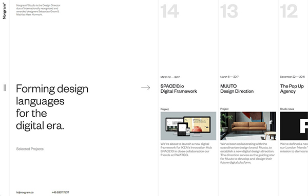 當(dāng)你⑴次瀏覽一個采用水平滾動導(dǎo)航的網(wǎng)站時,體驗起來可能會覺得非常的奇怪,首先它的物理和視覺運(yùn)動方向和常規(guī)的縱向滾動不同,而且當(dāng)你使用鼠標(biāo)滾輪滾動的時候,這種交互的錯位感會極其強(qiáng)烈。其實,想要解決這個問題,需要設(shè)計師加入視覺線索來幫助用戶導(dǎo)航,強(qiáng)化瀏覽邏輯和體驗即可。