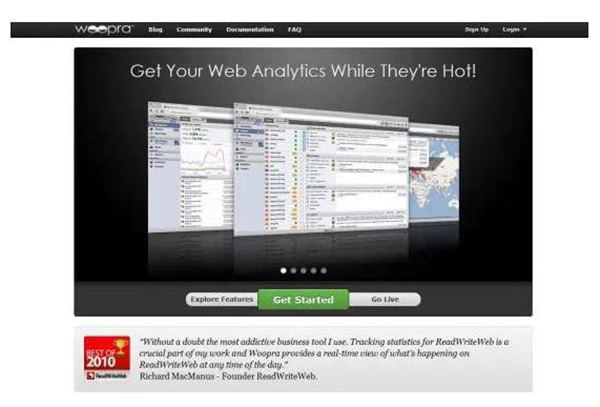 Woopra的出現(xiàn)將實(shí)時統(tǒng)計帶到了另一個層次,它能實(shí)時直播網(wǎng)站的訪問數(shù)據(jù),你甚至可以使用Woopra Chat部件與用戶聊天。不僅如此,另外,Woopra還擁有先進(jìn)的通知功能,可讓你建立各類通知,如:電子郵件、聲音、彈出框等。