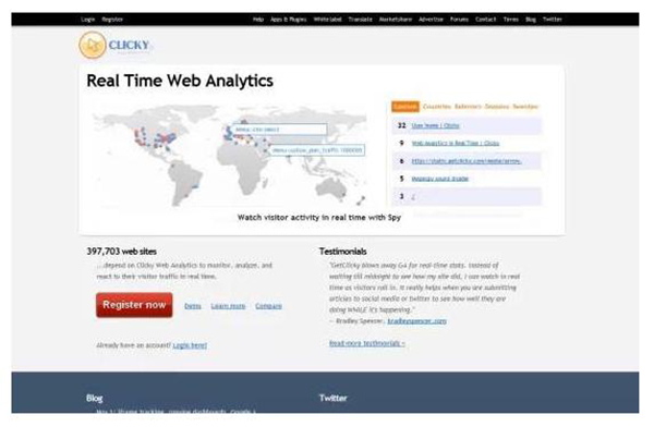 Google Analytics是一個使用非常廣泛的訪問統(tǒng)計工具,目前它推出了一系列的新的功能,可以提供實(shí)時報告。你可以看到你的網(wǎng)站中目前在線的訪客數(shù)量,了解他們觀看了哪些網(wǎng)頁、他們通過哪個網(wǎng)站鏈接到你的網(wǎng)站、來自哪個國家......。
