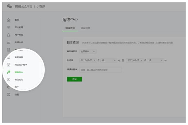 為了幫助開發(fā)者及時發(fā)現(xiàn)小程序運(yùn)行中出現(xiàn)的問題,公眾平臺新增小程序運(yùn)維中心。開發(fā)者可以在運(yùn)維中心查詢小程序最近30天內(nèi)出現(xiàn)的錯誤信息,快速修復(fù)問題。