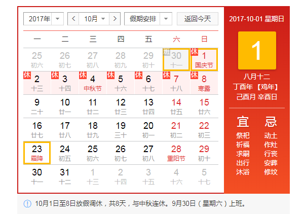 從2017年10月1日至10月8日,放假調(diào)休8天,10月9日(星期一)正常上班。9月30日周六正常上班。
