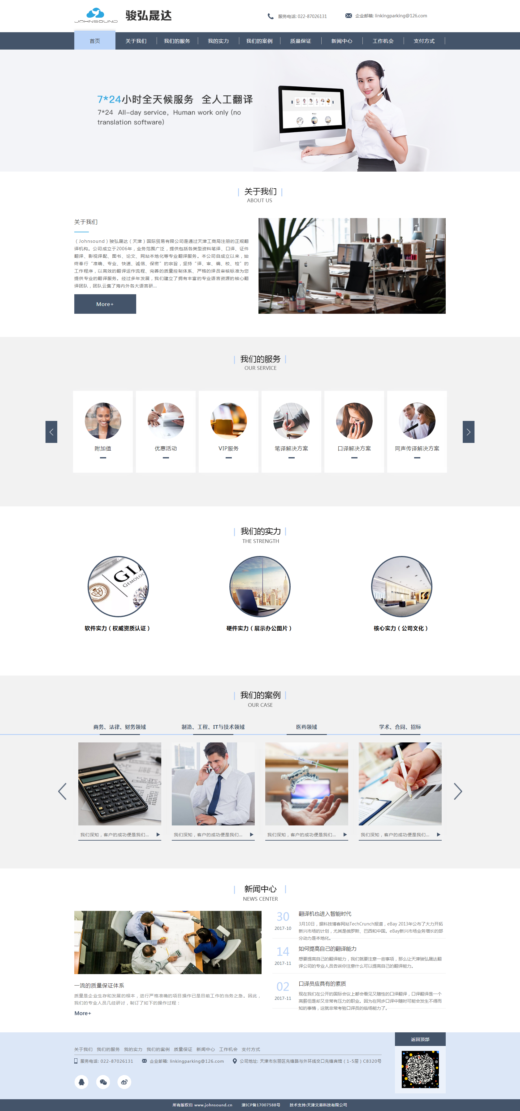 (Johnsound)駿弘晟達(dá)(天津)國(guó)際貿(mào)易有限公司是通過(guò)天津工商局注冊(cè)的正規(guī)翻譯機(jī)構(gòu)。公司成立于2006年,業(yè)務(wù)范圍廣泛,提供包括各類(lèi)型資料筆譯、口譯、證件翻譯、影視譯配、圖書(shū)、論文、網(wǎng)站本地化等專(zhuān)注翻譯服務(wù)。本公司自成立以來(lái),始終奉行“準(zhǔn)確、專(zhuān)注、快速、誠(chéng)信、保密”的宗旨,堅(jiān)持“譯、審、編、校、檢”的工作程序,以高效的翻譯運(yùn)作流程、完善的質(zhì)量控制體系、嚴(yán)格的譯員審核標(biāo)準(zhǔn)為您提供專(zhuān)注的翻譯服務(wù)。